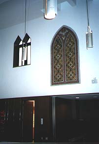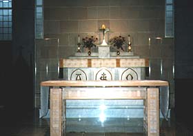 二階席より。 祭壇、薔薇窓は 旧礼拝堂のものを再生。 祭壇横に納骨箱が 300並び、 聖卓を囲む形で 礼拝を献げます。 |