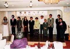 3月26日(日)浦地司祭最後の礼拝終了後、京都サンフラワーホテルにおいて「感謝の集い〜やっちゃんこうちゃんありがとう〜」が開催されました。岩城征文兄、末松玲子姉の名司会のもと、比較的(?)若い世代の実行委員が企画した、ゲームに歌にと笑顔いっぱいの楽しいパーティーになりました。恭子夫人のスピーチの折りには、浦地司祭はヘッドホーンをつけられ、「何でも遠慮なくおっしゃってください」という司会の声。出席者も大喜びでした。
