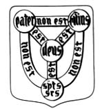 上の図は古い時代から用いられてきた聖三位一体のシンボルの一つであり、三位一体の教理の図解でもあります。楯型の「枠とその影響を取り除いた図形の輪郭を逆三角形に見立て、中央のdeusと書かれた球が手前に浮き上がっていると想像すると、三角錐(正四面体と考える方が良いでしょう)を真上から見た図と見なすことができます。