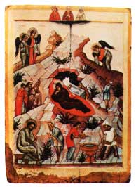 上の図はキリスト降誕を描いた一五世紀ノブゴロード派のイコンです。左下の聖ヨセフは、老人の姿をした悪魔の試みに耐えていると言われます。 (古谷功「イコン」より)