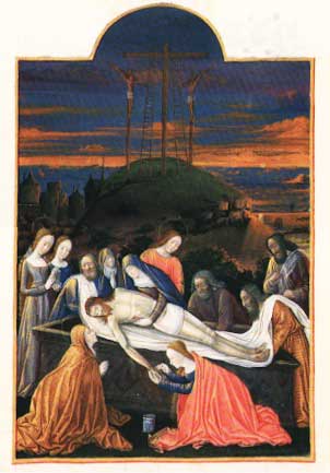 (図は14世紀『ベリー候の豪華時祷書』より「キリストの埋葬」。主の遺体が聖母やアリマタヤのヨセフらの手で石棺に納められるところ。マグダラのマリアは、ニコデモの持参した没薬と沈香でイエスの手の傷口をふさいでいます。右肩に垂れている長い髪の毛は、西方における彼女の伝説的象徴です。)