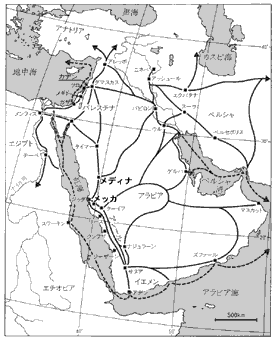 メッカはイェーメンからシリアに至る隊商路の要衝であり(地図参照)、多神教アラブの偶像礼拝の本山カーバ神殿があって、各地から巡礼を集めていました。このカーバ神殿が後にイスラームの聖地となります。