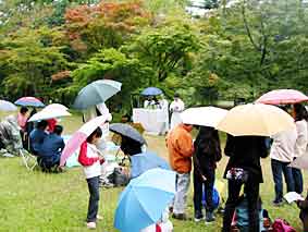 10月21日(日)、京都大学農学部上賀茂試験地にて野外礼拝が行われました。参加者は、大人子供合わせて31名。朝8時30分に教会に集合し、5台の乗用車に分乗して現地へ。また一方、日曜学校の一行も秋の遠足をかねて、こちらは叡山電鉄を利用し、精華大学駅から徒歩で現地へ。先発組が聖餐式のセッティングをしている途中からポツリポツリと小雨が落ちてきました。聖餐式と日曜学校礼拝に分かれてそれぞれが始まる頃には、写真のように傘の花が咲く状況になってしまいましたが、浦地洪一司祭司式のもと、無事聖餐式を終えました。