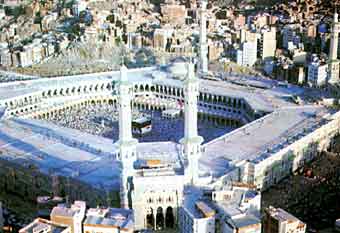 (写真は巡礼であふれるメッカのカーバ神殿。中央に小さく見える黒い建物が至聖所。世界中のムスリムの心がこの一点に集まる)