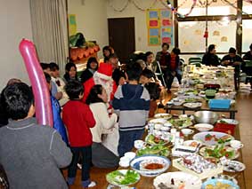 礼拝を終えるとお待ちかねクリスマス祝会。持ち寄りのごちそうはいつもの通りの超豪華版。婦人会の方々を中心に腕に縒りをかけた逸品が並びました。服部卓爾さんの司会のもと、ゲームあり歌ありと楽しいひとときを過ごしました。そしてクライマックスは子供たちお待ちかねのサンタさんの登場。子供たちはプレゼントを手にして大喜びでした。