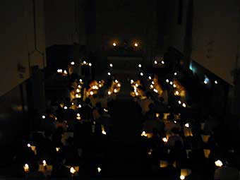 クリスマスイブのキャンドルサービスは昨年に引き続き「九つの日課による唱詠晩祷」です。各日課を教会各部の代表が朗読し、最初から最後まで蝋燭の光だけで礼拝を捧げました。出席者は約100名で、二階会衆席まで満席になりました。一般の出席者も多く、外人旅行者らしき人や、クリスマスイブを二人で過ごすカップルも数組見られました。