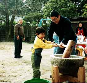 恒例の『お餅つき』。園庭で一生懸命に準備をして下さっている、お父さん・お母さんの姿を二階のベランダから何とも嬉しそうに見つめる子ども達の姿・・「おとうさ〜ん!○○(お名前)は、ここにいるよ〜!!。」お餅つきというだけでも、楽しくて仕方ないのに、幼稚園に、お家の方がいらして一緒に・・・というのは、子ども達にとって心弾む特別な日なのです。いつも礼拝堂でお会いするチャプレンに、今日は特別お二階に来て頂いて、みんな揃って礼拝をお捧げし、今日のこの日をお与え下さった神様に感謝し、また残念ながらお休みのお友達の為にもお祈りをしました。さあ!心静かに・・・お礼拝の後には、いよいよ!お楽しみの、お餅つきです!エプロンを着けて!お餅をつく杵は、思っていたよりも重く、みんな「よいしょ〜!。」と、大きな掛け声で元気一杯。今度は、お餅を実際に丸めるのですが・・その感触!そして!園長先生がつきたてのお餅をみんなのお口に!「おいし〜い!。」と、みんな満面の笑み!お待ちかねの、お餅を頂く時間には・・お母さん方の愛情たっぷりの色々なお餅、そしてお雑煮に、みんなで舌鼓を打ち!?というよりも、みんな食べるのに夢中でありました。心もお腹も!大満足の一日でした。