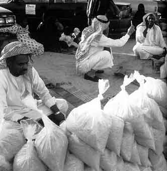 写真はラマダーン月の終わりに貧者への喜捨のために売られている3キロの米袋(サウジアラビア)