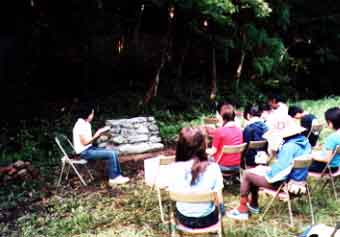 ワークでは、「芦生に祭壇を・・」ということで、川原から大きな石を運び、セメントでモルタルを練り、石を固めて素敵な祭壇を作りました。早速、その祭壇の前で礼拝を献げることができました。
