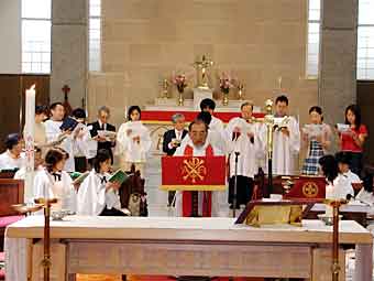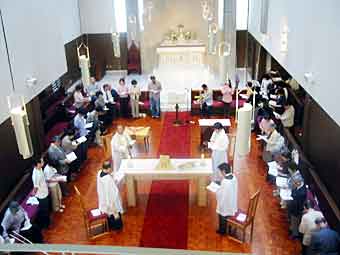 また、使徒言行録の朗読に合わせて、インドネシア語・タイ語・日本語・ロシア語・ギリシア語・ラテン語・ドイツ語・イタリア語・スペイン語・フランス語・英語・ヘブライ語の十二カ国語の言語で一斉に当日の使徒書(Tコリント)が朗読されました(ただしヘブライ語だけは詩編133)。「一同は聖霊に満たされ、『霊』が語らせるままに、ほかの国々の言葉で話しだした。(使徒言行録2―4)」を実際にやってみようという試みです。発音が間違っていても、例え何を喋っていても、会衆席の方々には判らないのに、必死に練習して来た朗読者もチラホラ…。礼拝後の報告では、[各国からのお客様]として紹介されました。
