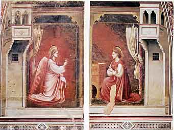ジオットによる、天上における天使ガブリエルの派遣の図を前号で見ました。その図の左下と右下に、内陣のアーチを隔てて、天使ガブリエルとおとめマリアが向き合っている姿の一部分が見えていました。その天使とマリアを取り出して並べたものが下に掲げた図です。よく目にする受胎告知図のように一枚の絵として描かれているのではなく、二人の間には内陣があり、その奥に至聖所と祭壇があることに注意しましょう。二人の間は至聖所によって隔てられ、天的存在と地上の人間との距離を表わすかに見える一方、この無限の隔たりが祭壇の媒介により結びつけられて一つの出来事を構成する。そのような強い緊張関係が感じ取られます。