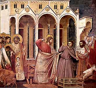 図はジオットの「宮きよめ」で、牛や羊や鳩はヨハネ福音書からです。弟子たちは「あなたの家を思う熱意がわたしを食い尽くす」という言葉を思い出したのでしょうか(ヨハネ2・17)。右端では、イエスを殺そうと謀る祭司長や律法学者たちが険しい眼をイエスに向けています。おびえる子どもたちは何を意味するのでしょうか。
