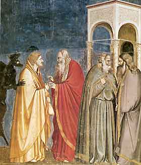 これを見ていてあらためて気づきましたが、夜空のようなこの暗い濃紺の背景は、イエスの生涯を描いた一連の壁画のほとんどすべてに共通しています。それゆえこの色が、これらの絵で覆われたスクロヴェーニ礼拝堂の壁面全体の背景色となります。それはこの世の闇を象徴するかのようで、それによってイエスの全生涯の出来事が闇の世を舞台として展開されたこととして浮き彫りにされ、同時に、闇の力との対決と勝利というテーマが壁面全体を通して表現されることになります。そうだとすると、闇の凝集としてサタンが姿を現すこの場面は非常に重要であり、影のようなサタンこそ、この場の主人公となります。