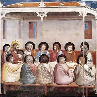ジオットによる最後の晩餐の場面です。正面には壁を背に五人の使徒がこちら向きに座り、手前のベンチには五人が向こう向きに座っています。左手の壁を背にイエスともう一人の使徒が右向きに座り、イエスの胸に寄りかかる弟子はその足許に跪いているようです。この食事の席全体を天蓋のようなものが覆っていますが、その柱は異様に細く、下部は透明で背後の人物が透けて見える、非現実的な存在です。天蓋の上にはジオット特有の空の色がわずかに見えます。天蓋は同時に建物の屋根を表すのかもしれません。この場面におけるこの空間的枠組みは、そっくりそのまま洗足の場面(次号)でも用いられます。