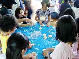 今年のキャンプの目玉は、『みんなで学ぶ天地創造』。夕闇が琵琶湖を覆ったメインキャビンに「光あれ」の声でローソクに明かりが灯され、天地創造の物語が、繰り広げられました。聖書の物語をしっかりと頭に入れた子どもたちは、大自然の中での生活を通して体全体で神さまの恵みを感じたことでしょう。神さまが良しとされたこの世界の中で、自分を愛し、お友達を大切にする事を学ぶ機会になりました。「ナン」作りにも挑戦し、神さまが土の塵から人間を創られたように、強力粉をこね、人の形に整えていき、汗びっしょりになって焼き上げました。最終日には「思い出ボックス」に友情と思い出をいっぱい詰め込み元気いっぱい帰ってきました。
