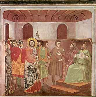 さて、左図でジオットは大祭司が衣を引き裂いた瞬間を描きます。マタイまたはマルコに基づくことは明らかですが、最高法院の裁判らしくは見えません。彼はイエスの衝撃的な自己証言を聞いた人びとの殺気立った反応を描く一方、それをよそに、憂わしげな顔をこちらに向けて立つイエスを描きます。その姿は、その場の騒然とした空気と他の人々すべてを背景に押しやっています。ジオットの一連の壁画で、イエスの顔を正面から描いたものはごくわずかです。この場面で、なぜこちらを向いておられるのか、何を見ておられるのか、とても気になるところです。