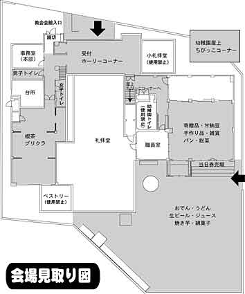 会場は園庭、幼稚園ホール、屋上、会館ホールの4つのコーナーに分かれています。礼拝堂入口、幼稚園南玄関で靴袋を渡しますので、靴は各自でお持ちください。