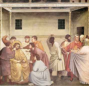 ジオット描く下図に、画集では「鞭打ち」のタイトルがつけられています。しかし内容的には、時間を異にする三つの場面が複合的に描かれています。いわば、四次元空間を二次元に投影した絵と言えるでしょう。画面は左側と中央部と右側の三つに分かれます。例によって、ジオットは複数の福音書の記述を重層的に用いています。