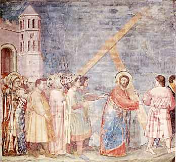 十字架を担ってゴルゴタへの道を進まれる主が、こちらを振り向いて口を開こうとしている様が下図に描かれています。ジオットが主の御顔を正面から描いているのは、少年イエス(6月号)とピラトの裁判(10月号)、それに今回の場面の三つだけです。