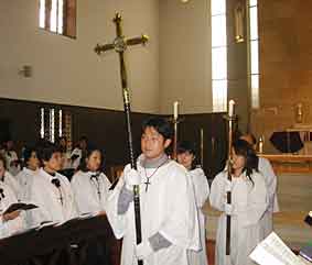 クリスマスイブに行われるキャンドルサービスは「九つの日課による唱詠晩祷」。聖書朗読・黙想講話と黙想・お祈りを各日課ごとに行う聖マリア教会独特の形で、五年目となります。聖堂に響き渡る聖歌隊の歌声とともに、蝋燭の光のもと、荘厳な礼拝を捧げました。