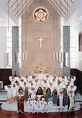 当日は、これまでの暖かな日々が嘘のように、随分と冷え込み、イエス様がお生まれになった「その日」のように感じられました。「せんせい、きんちょうする…」と言いながら、控え室のベストリーの鏡に自分を映して自らを律しながら、小さな心を緊張で震わせながら、時に涙を流しながら頑張る子ども達。そんな子供たちの姿を目のあたりにして、その成長に驚き、喜びを感じる、本当に幸せに満ち溢れる瞬間です。神様が、下さった命がこんなにも輝いているなんて!子ども達の柔軟な心は、理屈抜きに、イエス様がこの世にお生まれになったことがどんなに幸せなことかを、私たちに教えてくれます。子ども達が直向に、自分達の役割を果たすために努力している姿は、私たちの為に、思いを尽くして愛してくださったイエスさまの心そのもののように思うのです。そして、まぶね礼拝の終わりには、こんなお祈りがあるのです。「…苦しんでいる人、悲しんでいる人、そして、世界中の人々が幸せになれるようにお導きください…」と。この小さな、お祈りが様々な壁を乗り越えて、人々の祈りとなり、子ども達が幸せに暮らせるようにと切に願います。