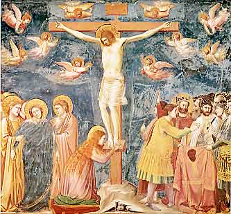 イエスの足を撫でながら泣くマグダラのマリア。気を失った母マリア、それを支えるヨハネたち。空では天使たちが嘆き、イエスの血を杯に受け、あるいは見守ります。ジオットは四つの福音書を組み合わせつつ、さらに踏み込んだ情景を描きます。