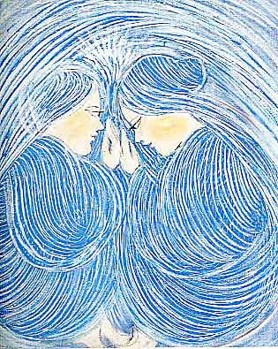 これは「サッテヤ…言葉と絵による黙想」(日本基督教団出版局)の中の、「受胎告知」と名付けられた絵と、それに添えられた詩です。作者はナリニ・ジャヤスリヤという女性で、スリランカで活動しています。彼女は、クリスチャンが少数派である地域において、アジアという文化的背景を持ったクリスチャンとして、自らの信仰を絵で表現しようとしています。そのため彼女の絵は、「キリスト教絵画」としては大変ユニークなものです。この受胎告知の絵も、他では見られないような構図になっています。二人の人物が向かい合っています。ほぼ同じ姿勢をして、同じような表情をしていますが、かすかに違いが見られます。左側の人物の方が顔を正面に上げ、手を若干高くあげています。それに比べると右側の人物は少し顔を伏せ、手も少し下げています。髪型の違いからすれば、右側がマリアで、左側が天使のように思われます。そうすれば、天使のお告げをマリアが恭しく聞いている姿に成ります。もしかすると左右が逆かもしれません。そうなれば、天使が神のひとり子の御母に敬意を払っている姿になります。それらよりもこの絵を見てまず目を取られるのが、二人の人物が、それぞれ背中を丸め、身をかがめ、一体となっていることです。さわやかな水色の絵の具を削って作りだしたであろう白い線が、二人を円形に囲み、その線が幾重にも重なることによって、二人の人物が、何か大きな流れによって一つの固まりになったように見えます。ここでは、天使とマリアという二人の違いよりも、一つに融合させられた事の方が大きく表現されています。詩にあるように、マリアは地上の人々の代表であり、天使は天の世界の代表であって、受胎告知の出来事は、天と地との境が打ち破られ、一つとさせられてゆく出来事なのです。全ての人の間の、そして人類と神様との和解と一致が、イエス様の誕生の前、そのお告げの時から始まった、ということをこの絵は表現しているのでしょう。