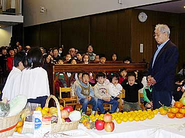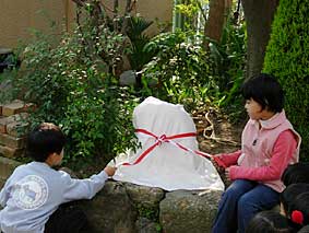 晩秋の南禅寺に子ども達とお散歩に出掛けました。神様の御業は本当に計り知れませんね、美しい紅葉に心が静かに高鳴ってゆくのを覚えました。折々の祈りの日々、毎日の園生活の中で子ども達と共に「ありがとう」を幾度となく言葉にし、また心に携え歩んでいます。先日、収穫と勤労の感謝を込めて「感謝祭」のお礼拝(第一部)をお捧し、日々私達の幼稚園の事をいつも心に覚え、本当にあらゆるところで様々なお世話をして下さっている方、今年度は、教会信徒の久保田栄三さんをお招きいたしました。久保田さんは、子ども達もいつの間にやら「おじいちゃん!」と親しみを持って呼ばせて頂く程ですが、改めて子ども達がこの度「ありがとう」の気持ちをお伝えする機会を与えられました。また、子ども達の命を繋いで下さっている祖父母の皆様もお招きし、お礼拝に引き続き、第二部では歌・劇ごっこ・リズムバンドをご披露し子ども達の成長の様子をご覧頂きました。身近な人に感謝する心「生きている」事を含めて感謝出来る幸せを子ども達の姿を通して考え、言葉にしなくとも目には見えない、神様の御業を御恵を御祝福を心で感じられた事を糧にしてこれから迎える、大切なクリスマス・イエス様の御誕生に喜びと感謝を持って皆で「愛」の光を輝かせたいと思います。「愛」に満たされて育くまれる幼子は本当に幸せです。教会信徒の皆様もいつも幼稚園を子ども達を覚えお祈り下さっています。子ども達に「愛」を下さる大切な方々だと、常々感謝致しております。その中のお一人である田中泰之さんより「あい」の贈り物を頂きました。常日頃、田中さんには、お庭を綺麗にして頂く事のみならず子ども達に神様からの賜物をあらゆる形でお教え頂いています。そんな田中さんからの贈り物は、幼稚園のご門を入ってすぐ左手の団栗の木の下に・・・除幕式のご準備までして頂き、お庭で月曜礼拝をお捧げした後、子ども達と「あい」を目で心で見つめました。さて!「あい」の贈り物とは一体何でしょうか?どうぞ、幼稚園のご門に足をお運び下さいませ。そして、子ども達と共に「愛」の光を輝かせましょう!主に感謝。