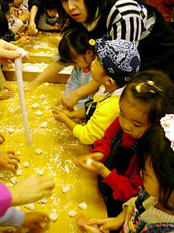 子ども達が丸めたお餅は保護者の方々がきなこ、あんこ、ごま入りのあんこ、いそべ餅、またお雑煮にして下さり、お昼には子ども達全員でそれらのお餅をいただきました。各々自身で関わったお餅を「おいし〜い!」とほっぺたを押さえながら食べる子ども達。お代わりもあっという間になくなりました。