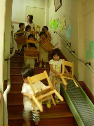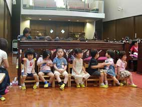 園庭にうずくまる子ども達の姿…小さな手の中には「だんごむし」が。お天気の良い日は園庭遊びに夢中の子ども達です。今年度、年少組(花組)は21名(2名が満3歳児)でのスタートとなりました。入園式から早くも二ヶ月が経とうとしています。入園当初、大好きなお母さんとの暫しの別れに小さな胸が不安ではち切れそうになって涙が溢れた事もありました。「おかあさん、きはる??」と何度も先生に尋ねた事もありました。そんな子ども達もすっかり幼稚園生活に慣れ、元気に登園し毎日心弾ませ過ごしております。毎日が初めての経験・出会いの子ども達、集団生活での様々なお約束(ルール)も少しずつ身に付き、また自分の身の回りの事も少しずつ自分で出来る様に、みんな一生懸命です。毎週のチャプレン先生の月曜礼拝・園長先生の水曜礼拝の際には、それぞれ自分の座る椅子を二階の花組保育室から礼拝堂まで自分で運びます。自分の体がすっぽり隠れるくらいの椅子をしっかりと持って、一歩一歩しっかりと階段を下りる子ども達。緩やかな木のぬくもりのある階段、長い歴史の中、何人の子ども達がこの階段を行き来し、立ち止まり、見上げ、振り返りしたのでしょうか…。今年もまた21名の小さな花組が毎日行き来しています。やっとこさっと椅子を持ち、礼拝堂に辿り着くと何とも言えぬ安堵の表情を浮かべてほっと安心、けれども、ここは(礼拝堂)神様のお家だから心静かにしなくっちゃといつもとは一味違う子ども達の姿・表情が何とも可愛らしく、愛おしいのです。子ども達にとって、もう礼拝堂は特別の場所になっています。幼稚園に入園し、初めて『神様』と出会った子ども達、毎日のお礼拝で小さな手を合わせ「お祈り」をする事。神様に「きのうのよるもおまもりくださってありがとうございました。」と新しい朝に感謝する事からスタートする一日。「ありがとう」に毎日出会える幸せをしっかりと感じて、子ども達と共にじっくりと歩んでいきたいと思います。これから、子ども達にどんな経験・出会いが待ち受けているのでしょうか。どうぞ、そんな子ども達の為に今年度もまた教会の皆様に色々とご理解・ご協力頂く事になるかと存じます。よろしくお願い申し上げます。