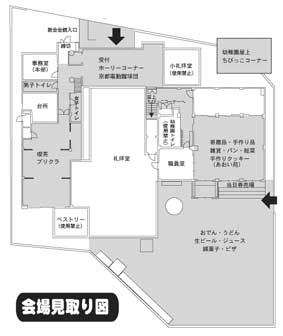 今年も昨年同様、主日礼拝に全員で一緒に出席してからのバザー開催となります。また、障害者福祉施設の「あおい苑」様に場所を提供しクッキーの販売も行います。そして新たなブースとして電動車椅子サッカー「SONIC 〜京都電動蹴球団〜」の活動紹介を行います。実際に試合で使用している電動車椅子の展示もします。どうぞお立ち寄り下さい。実行委員会メンバーも皆さん忙しいメンバーばかりではありますが、バザーを成功させたいという一心で、数回のミーティングにて企画を練り、短期に集中して準備を進めてきました。バザーは「収益活動」の一環ではありますが、皆が一同に集う「お祭り(イベント)」であり、また「地域の方々に聖マリア教会の存在」を存分にアピールする場でもあります。ぜひこの機会に教会、ボーイスカウト、幼稚園が一体となって、一つの目標に向けて協力しあっていきましょう。またご近所の皆さん、お友達にも声をかけていただき、一人でも多くの方に教会や幼稚園、ボーイスカウトを知ってもらいましょう。 受 付 受付は二カ所あります。一つは教会の正面、丸太町通から礼拝堂に入った前室です。すでにお送りした前売りチケットの精算がまだの方はここでお支払いください。また、チケットをお持ちでない方、追加で必要な方はこの受付で購入できます。 チケットはおでん400円、うどん400円、喫茶セット300円が連なったもので、額面1100円を100円で販売します。バラ売りも可能です。この三種以外の出し物については現金でお買い求めください。 もう一つは園庭のサブ受付、こちらでは当日券を販売しています。おでん、うどんをもう一杯という方、園庭から入ってこられた方はこちらで購入してください。 自転車は教会の前に止めず、整理誘導係りの指示にしたがってください。なお、当日は乗用車の来場はできませんので、ご注意ください。 会場は園庭、幼稚園ホール、屋上、会館ホールの4つのコーナーに分かれています。礼拝堂入口、幼稚園南玄関で靴袋を渡しますので、靴は各自でお持ちください。 飲食コーナー *おでん この季節は、やはり「おでん」なくして語れません。婦人会によるアツアツのおでんがバザーの熱気を盛り上げてくれます。持ち帰りもできますので、バザーで食して、ご自宅での夕食にもどうぞ。 *うどん すっかりマリア名物になった「きつねうどん」。谷口店主がこだわります。最後に汁をすする時、特性だしに溶け込むきつねの油と薬味のねぎ、七味の香が至福のひと時を。 *喫茶セット 青年会とジュニアチャーチのおもてなしによるケーキと飲物のセット。好評の手作りケーキは絶品、この日のために心を込めて焼き上げたケーキをお選びください。恒例の生演奏は発表会形式でピアノその他のアコースティックサウンドをお聴かせします。 *綿菓子 子供たちに大人気の綿菓子。マリア綿菓子オリジナル機が、綿菓子職人の手元でモーター音を轟かせます。お子さんだけでなく、大人も童心に返って砂糖の甘いにおいごとほおばってみてはいかが。 *生ビール・ジュース 買い物をしてお食事をして、生ビールで一休み。今年もたくさん飲んでもらいます。ビール券差し入れも大歓迎。 *ピザ ヨゼ クニオリによる手作りピザ。本場仕込みの見逃す事の出来ない一品です。数に限りがありますので早い者勝ち!乞うご期待!! 物販コーナー *寄贈品 今年も幼稚園ホールを埋め尽くす寄贈品の数々。生活必需品からレア物まで、店員スタッフとかけ合いしながら、見て触って、じっくりと。 *お総菜 京都聖マリア教会婦人会が腕によりをかけて作ったお総菜。毎年、昼前には売り切れる人気コーナー。 *クッキー あおい苑入所の方々が心を込めて作られたクッキー。一度ご賞味あれ。 *雑貨 世界のマーケットプレースを超極小にしたコーナー。思わぬ掘り出しモノが! *手芸品 ホームメイドのあったか品が揃っています。 *ホーリーコーナー 教会バザーならではのホーリーコーナー。足を止めてご覧ください。クリスマスグッズや愛らしい小物たちがあなたを待っています。 *プリクラ 今年もやります。撮影スポットも選びません。来場を記念して、藤原司祭とのツーショットもOK! *パン パンの老舗「進々堂」社長のご好意により、パンコーナーを設けてくださいます。自慢の味をご賞味ください。 *びっくりコーナー? 「何これ!」と思ったら、そこがびっくりコーナー。どこにあるか、何があるのか、誰がいるのか、マリアの好事家が何やら準備しています。 その他 *子供コーナー 幼稚園屋上はボーイスカウト・ハンドベルクワイヤーメンバー有志による子供コーナー。常連となっているコイン落とし、コリントゲーム、バルーンアート、を始め、その他いろいな企画を練っています。安心して遊べる楽しいコーナーです。ぜひ子供たちを連れていってください。 *京都電動蹴球団 障害者スポーツ「電動車椅子サッカー」の京都唯一のチーム「ソニック〜京都電
