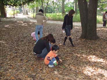 夏には御所の出水の小川で遊びましたが、同じ御所でも今月はリニューアル・オープンした、児童公園へ出かけました。魅力ある小さい子用の遊具もありましたが、児童公園の周りにはうっそうと大きな森のような木立が…!探検隊気分で入っていくと、落ち葉の下から不思議な形のきのこが顔を出し、あまり街中では落ちていない、しいの実がどっさり!秋は面白い、秋は不思議と感じた様です。そして前回子供たちが牛乳パックで作ったバックが秋の収穫でいっぱいになったのでした。毎回活動がそれで終わってしまうのではなく、お散歩一つにしても、行く前からどんな経験が出来るのか、期待に胸を膨らませる様にと準備しています。お散歩の次の日には秋の収穫をみんなで見て、更に経験を繋げた活動を行い、深めていくプログラムが組まれています。