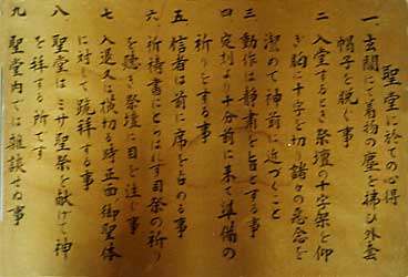 橋本基督教会の聖堂入り口に、質素な額に飾られた、達筆の文書が掲げられています。永年牧会された佐伯博厚司祭のお連れ合いで、元婦人伝道師の佐伯末子先生の筆です。内容は次のようなものです。「聖堂に於いての心得 一、玄関にて着物の塵を払ひ外套帽子を脱ぐ事 二、入堂するとき祭壇の十字架を仰ぎ胸に十字を切り諸々の悪念を潔めて神前に近づく事 三、動作は静粛を旨とする事 四、定刻より十分前に来て準備の祈りをする事 五、信者は前に席を占める事 六、祈祷書にとらはれず司祭の祈りを聴き祭壇に目を注ぐ事 七、入退又は横切る時正面ノ御聖体に対して跪拝する事 八、聖堂はミサ聖祭を献げて神を拝する所です 九、聖堂内では雑談せぬ事」これらの九箇条が、古い字体の漢字で書かれています。