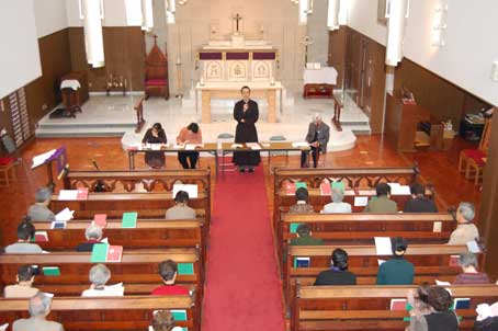 2月17日(日)、礼拝堂において受聖餐者総会が開催されました。午後1時過ぎ、出席者43名、委任状78通、現在受聖餐者148名の過半数の出席を確認して、議長藤原健久司祭が総会の開催を告げました。聖歌443番を歌い、お祈りと藤原司祭の挨拶をもって始まった今年の総会。一週間前に配布された総会要項冊子『教会のあゆみ』に沿って進められました。2007年度の主な行事、2008年度の主な行事予定が確認され、【教籍異動】の報告、【各部活動報告】の補足・訂正後、挙手をもってそれぞれ承認されました。