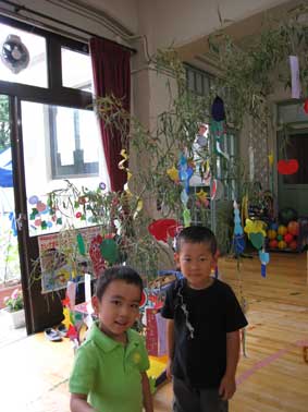 7月の幼稚園。4日には、7日の「七夕」に向けて、教会の田中さんのお世話で頂いている笹と約一か月かけて取り組んだ七夕飾りとを持ち帰りました。織姫様と彦星様が一年に一度、天の川で会う事が出来る日。そのお話の素話(絵本や紙芝居等絵を見る事なく、先生のお話だけでイメージを膨らませて聞きます)を聞いて、七夕飾り作りが始まりました。短冊や五色つなぎ…等など、先生の説明をしっかりと聞き、見本を見て、のりやはさみ、クレヨンといった道具を使い、切る、貼る、描くと、手先を動かし、自分の五感を存分に使って、各組、その年齢に合わせた、簡単なものから、難しいものまで十数種類を作って行きました。難しい作品を作っている時には、眉間にしわを寄せながら悪戦苦闘していた子ども達。出来上がった作品を「せんせい、できた!」と見せに来る時には、にっこりと、とても良い表情で、出来た喜びを体いっぱいに表現してくれていました。箱に入れて持って帰った七夕飾り、七月七日はそれぞれのお家で笹の葉に飾られ素敵に風に揺れていた事でしょう。一生懸命作った世界に一つの七夕飾り。あるお家では花組・赤組・緑組の時の飾りをそれぞれの年の成長の記録になると全部、残しておられるとか。嬉しい事です。