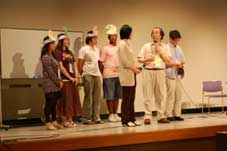 この町は過疎対策として彼らの受け入れを町の政策として掲げているのである。私どもは実習として市の図書館におけるスタンツを見せられた。そこでは本当の患者さんがソーシャル・ワーカーである大谷地先生や浦河日赤の精神科の医師に相談するところから始まる。患者さんは四、五人の「幻聴さん」を従えて登場する。この「幻聴さん」には私どもJCMAの会員が前もって台詞も教えられて扮したが、彼らは「お前なんか役に立たない存在だ」とか「早く死んでしまえ」などと囁きながら付いてくる。ワーカーや医師はそれを幻聴とは見なさず、それを肯定した上で「貴方には仲間がいるのだから、そんな幻聴などより仲間を信頼しなさい」という。患者は付いてくる幻聴を認められたことで安心し心を開く、というストーリーであった。