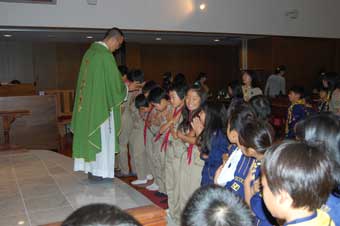 マリア名物のバザーです。これで三年目になる主日の聖餐式終了後開催。藤原司祭が効率的に短時間で礼拝ができるようつくった式分を手に、ボーイスカウト、幼稚園関係者も一緒に礼拝を献げることができました。