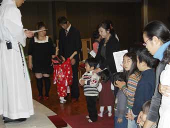 11月16日(日)幼児祝福式が行われました。一般に行われる「七五三」に代わるもので、当教会は毎年この時期に行っています。小学生低学年以下の子供たちは藤原司祭から祝福を受け、プレゼントをいただき、とても満足そうな笑顔を見せていました。