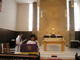 ウイリアムス神学館でのこの一年間の神学生生活の中で、私にとって特に大きな位置をしめていたのが京都聖マリア教会での教会実習でした。早朝五時に起床し、夜明け前の闇の中、神学館を出発しバスで教会へ向かいます。朝の礼拝の頃は、まだ外も薄暗く、ようやく早朝聖餐式を迎える七時頃には朝の光が礼拝堂に差し込みます。そして、主日主要聖餐式での聖餐の恵みに預かる正午頃には、太陽がステンド・グラスを通して、虹色のプリズムを白い大理石のオルターに映します。まさに、光り輝く私たちの主イエス様がそこに臨在されている思いがしました。