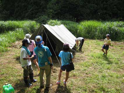 竹を切り出し水鉄砲を作り川でのプログラムで使いました。サイトの工作にも力を入れました。激しい雷雨に見舞われ不安な気分になるスカウトもいましたが今後の糧になると思います。くまスカウトも見学に来てくれ活動に参加してくれました。魅力的であったかはわかりませんがみんなの上進を待っています。
