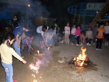 今年の夏はなんと暑いのでしょうか。少し動いただけで、額から汗が滝のように流れ、息も絶え絶え。テレビのニュースでは熱中症の話題でもちきりですね。こんな、暑い夏には、プールが一番!幼稚園では、今年も8月前半・後半に夏期保育を行い、おもいっきり、水に親しみました。8月5日・6日には、毎年恒例の年長緑組の『おとまりようちえん』がありました。午前中は年中・年少とプールを楽しみ、午後からは緑組だけのと・く・べ・つ・な時間。貸し切りプールに入ったり、思い出の作品<手作り帽子>を作ったり、黒谷さんまでの道のりを、地図を頼りに、その指令どおりの事をすると宝物がもらえるというオリエンテーリングをして過ごし、夕飯は、園長先生と愛先生が作って下さったカレーライスとサラダバイキング(八種類のうち五種類を取る)&ゼリーに舌鼓。「おうちのとちがうわ」「おっいし〜い」と大満足な子ども達でした。その後は、園庭でキャンプファイヤーに花火、特設マリア風呂で体をキレイにして、いつも遊んでいるホールに隙間無く、敷いてあるお布団にゴロン。うきゃきゃとはしゃぎながら今日一日、楽しかった思い出がいっぱい!気持ち良く寝ようと思ったら、いたずら好きなおばけがやってきて、みんながお昼に見つけた宝物を隠してしまったから、さあ大変。暗い幼稚園と教会の中を懐中電灯を持って探しました。元気に出発する子、こわごわ出発する子、大泣きして先生にしがみつく子…でも全員が探しに行き、宝物を無事に見つけ出す事が出来ました。チャプレン先生にお祈りをして頂きほっと一安心、眠りにつく事が出来ました。二日目もラジオ体操やプールを楽しみ一泊二日のドキドキハラハラの幼稚園は幕を閉じました。さぁ、8月の夏休みの思い出をいっぱい胸に、二学期が始まります。教会の皆様方には、いつも幼稚園の事をお覚え頂き、お祈り下さりありがとうございます。また、9月から始まります園児募集等々に、ご協力の程、どうぞ宜しくお願い申し上げます。