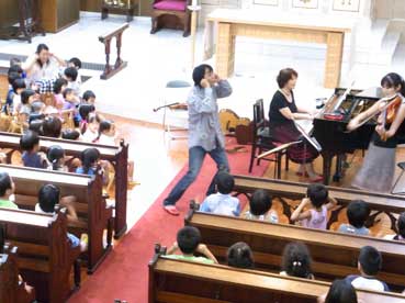 猛暑の日々をやっと通り抜け一気に「秋」の到来。朝夕は寒いくらい、日中も本当に凌ぎやすくなって来ました。心なしか川端通の銀杏の色に変化が見え始めている様に思います。草の中からの虫の声を聞き、漸く訪れた秋に心が躍ります。さて、残暑厳しかった九日十日には、毎年恒例の講演会(今年で十回目)を行ないました。当初未就園を対象に開始しましたが、子育ての支援は在園の子ども達とその保護者、さらに小学低学年くらい迄の保護者にもお集まりいただけるように内容を変更してきました。そして子ども達自身が自分の楽しさをいかに素直に表出できるのかを軸に、保護者との関係を大切にしなければならないという視点の中、「楽しんでもらいたい」という思いで講師をお招きしました。「音で育む絆、音で育む心」と題して、末松義密氏と西谷玲子氏、そして卒園生の田代直子さんの特別参加を得ました。楽しく、しっとり、賑やかに…と礼拝堂にお集りいただいた保護者の方々、未就園の親子、在園児のみんなが、一つになって、参加型の良き時間を過ごしていただけたように思います。サイレントべイビー と言われるようになって久しいですが、子ども達が思いっきり笑う、楽しさを身体全体で表現する、楽しいからせっせと自分をアピールしながら前へ進み出る、何やら知らぬ間に鼻歌を口ずさんでいる…というような、幼い時から家庭での「音」への取り組みと人間の関わりを勧め、共に受け入れて一緒に楽しむ。一点をのみ見つめる楽しみでなく、それが有るだけで、自分もそこに居る人も巻き込んでしまう和やかな雰囲気を感じて欲しい。そして、「こんな楽しい事にあの人も寄せてあげよ!」「お母さん一緒に○○してよ」との気持がそのままヨッシーさんのトークとバイオリンやスプーンの、何でも楽器になるような楽しげな演奏になりました。さらに、玲子先生のほんわか、優しいトーン、子ども目線のトーク、更に子ども達は「バイオリン!」と答えましたが、残念賞「ビオラでした」と初めて子ども達が触れた直ちゃんの新しい音色に魅せられたのです。幼い時に思いっきり笑って欲しい、思いっきり泣いて欲しい、思いっきり怒って欲しい、そんな事を経験しながら自分自身をコントロールして人格形成へ。それに対する大人も真剣に子どもの感情表現を受け止めて欲しいとの願いです。この園にとってさまざまな形で「音」を大切にして来ています。単音からメロディーへ、そしてどんどん仲間に広がって、みんなを楽しくさせる。なんて素敵なことでしょう。こんな聖マリア幼稚園の大切な部分をよ〜〜く存じて下さっている講師の先生方に感謝し、みな様への報告とさせて頂きます。