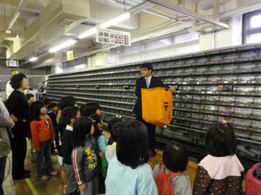 翌週の14日(月)勤労感謝の慰問にそれぞれ出かけ、『ありがとう』の気持ちをお伝えしてきました。花組はくろたに交番へ。(いつも私達の安全を守って下さっているおまわりさんへ歌のプレゼント。そしてパトカーをバックにおまわりさんと一緒に写真撮影をしました。)赤・緑組は左京郵便局へ。(普段は見ることが出来ない郵便局の裏側を見せて頂き、郵便システムの勉強をしました。大きな機械がはがきの仕分けをスタート!そのスピードの速さに歓声が上がりました。)