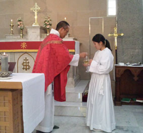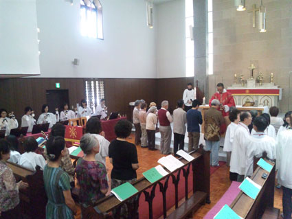 また、この日、テレーズ水野沙良ちゃんの幼児洗礼式が行われました。教父母は、立石るかさん、森田しおりさん、松本優平さんという、これからの教会を背負って行ってくれる若い世代。またサーバーも続木明佳さんが実習、聖歌隊にも吉村真綾さんをはじめ中学生がリードするなど若い世代が礼拝に活躍してくれる姿を頼もしく思いました。