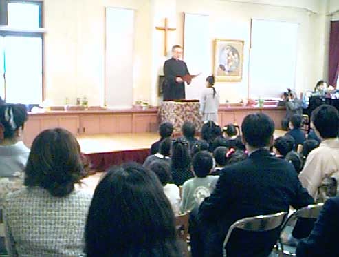 3月19日(金)、あいにくの雨天の中、聖マリア幼稚園1998年度卒園式が行われました。前日のお別れ会から涙・涙の先生方、保護者達の見守る中、対照的に笑顔いっぱいの卒園生11名が元気よく巣立っていきました。人格形成の第一歩である大事な時期をこの幼稚園で過ごし、キリスト教に触れることができた幸せをいつの日か大きく感じることと思います。在園中、一度も礼拝堂でお祈りができなかったこの子たちが、新しい礼拝堂を心から愛してくれますように・・・
