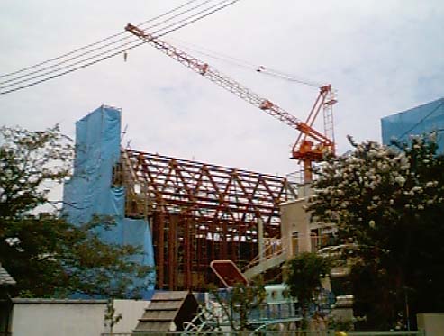 ○8月25日(水)〜28日(土)、鉄骨搬入。屋根および柱部分の鉄骨組み上げ、塔部分の鉄筋配筋、型枠建て込み工事。