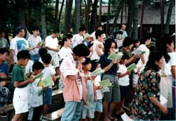 日焼けと思い出を残して 夏はキャンプの季節。湖に山に、子供も大人もよく遊び、よく学び、日焼けとともに多くの思い出を残しました。普段から教会内で顔を合わせているメンバーでも、丸々数日間一緒に生活すると違った側面を発見し、今までとは異なった愛し方?も芽生えます。また、自然は飽くことなくいつも最良の遊び相手であり、先生でもあることも実感します。神の御技は、その時々にかないて美しいことを感じる、そんな夏の一時を紹介します。 週一度ペースでの委員会を開いて、よりよい礼拝堂建築を目指す建築委員会は、委員会でのある程度の合意をまとめた「京都聖マリア教会礼拝堂建築について」を、教会委員会に提出し、教会委員会名で一般信徒のみなさんに内容を公開し、ご意見をうかがう機会をもちました。 内容は左記の通り。 日曜学校 7月20日(日)から21日(月)、今年も北小松キャンプ場において、キャンプが行われました。総勢102名の大家族キャンプとなりました。1泊2日というとても短い間でしたが、お天気にも恵まれ、子ども達は充分に水泳・キャンプファイヤーなどを楽しみ、おいしいご飯を気持ちの良い屋外でいただくことが出来ました。今年もキャンプができたことに神さまに感謝し、また、色々な形でみなさんにお手伝い・ご協力いただいた事に感謝しています。