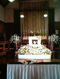 4月30日(木)午後7時30分より、幼稚園ホールで通夜の祈りが捧げられました。これは、ご本人の遺志により、その生涯を捧げた聖マリア幼稚園の床の上で、一般の通夜のように壁を白い布で覆ったりせずに、本当に幼稚園の雰囲気そのままの会場で行われました。参列者400余名。幼稚園ホールに入りきれない人々が園庭を埋め尽くしました。通りがかった近所の方があわてて着替えて通夜の祈りに出席される姿もたくさん見受けられ、本当に地域に密着した教育をなされていた良子先生のお人柄が伺えました。幼稚園の先生方、母の会、教会信徒の方々の協力により、大至急に用意した、通夜の祈り・葬送の祈り共通の式文600冊も、その大半がこの通夜の祈りに使われ、急遽予定を変更して、翌日の葬送の祈りのために回収することになったほどでした。