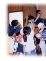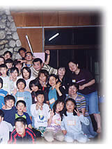 24人の小学生が北小松に集まりました。どの子も個性豊かな、すてきな子ども達ばかりです。このすてきな子ども達と一緒にキャンプをしたくて、20人を超える青年たちが集まり、準備を進めてきました。この人達も(実際の年令は様々ですが)心の中は若さと優しさで一杯の、すてきな人達ばかりです。 |