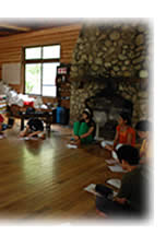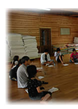 また、野外料理ではグループに別れて『キンパ(韓国のりまき)』をつくりました。のりを何枚もつなげて、ラップをすだれ代わりにし、「せーの!」と声をかけながら一生懸命巻いた長〜いのりまきは、子どもたちの背丈を越える180センチにもなるグループもあれば、ご飯が多すぎ、のりに巻ききれない「極太巻き」が出来上がるところも・・・ それぞれがキャンプならではの楽しい野外料理を堪能しました。